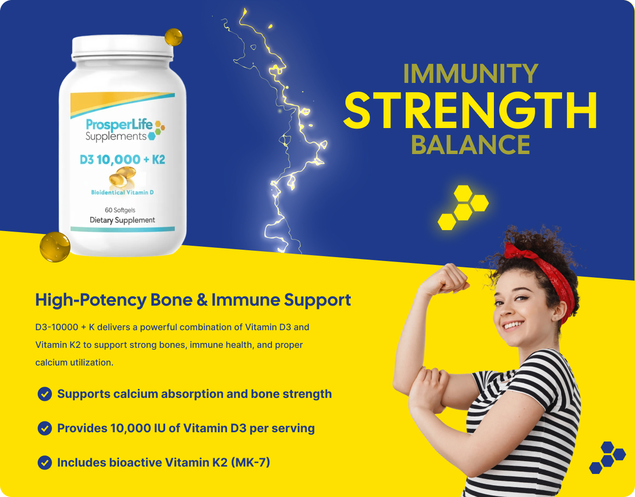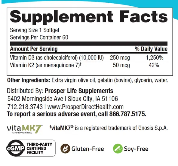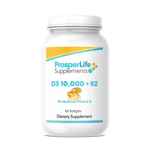 Elevate your health with ProsperLife's D3 10,000, meticulously crafted to support your wellness journey. D3-10000 is a natural, soy-free, bioidentical vitamin D supplement. Vitamin D, considered both a hormone and a vitamin, is manufactured in response to skin's exposure to sunlight and is essential to the body’s absorption of calcium. Natural vitamin D3 (cholecalciferol) is four times more potent than synthetic vitamin D2.* In Latin, calciferol means “calcium carrier.” Additionally, vitamin D has been the subject of numerous studies for its effect on the immune system by promoting phagocytosis and immunomodulatory functions.* Vitamin D3 is essential for optimal bone health, immune system support, and maintaining strong muscles. As part of our commitment to quality, our supplements are scientifically formulated to ensure the highest efficacy. Trust ProsperLife Supplements to empower your health with high-quality, reliable products. Experience the benefits of taking Vitamin D3 and invest in your well-being today. These statements have not been evaluated by the Food and Drug Administration. This supplement is not intended to diagnose, treat, cure, or prevent any disease.