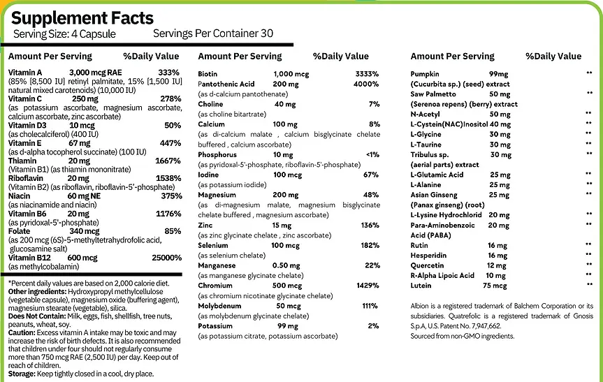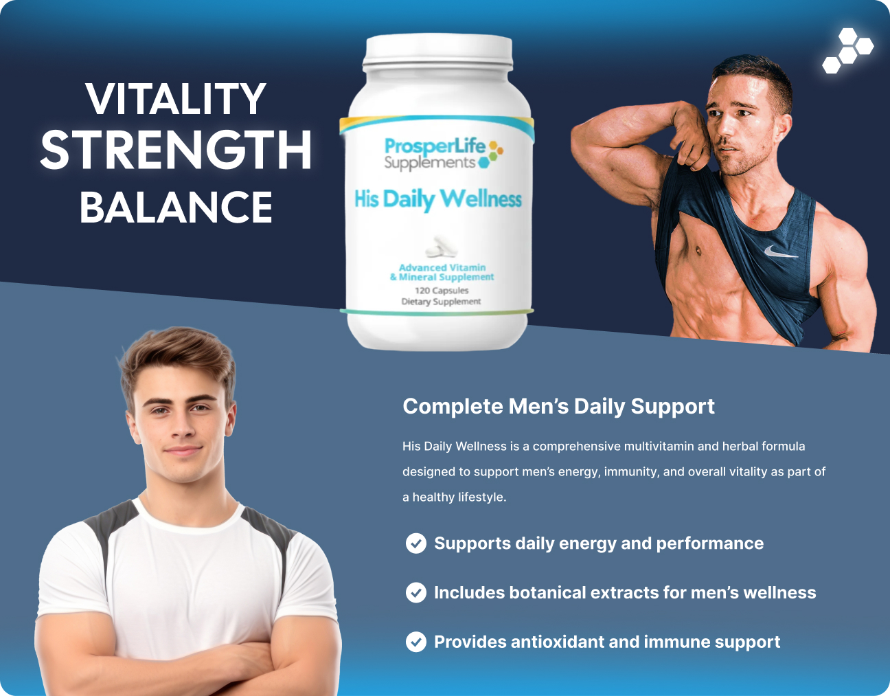 Introducing His Daily Wellness – a comprehensive multiple vitamin, mineral and herbal supplement, with select amino acids, designed specifically to support the unique nutritional requirements of men. This foundation multiple formula, in easy-to-swallow vegetable capsules, delivers select nutrients to support the prostate, liver, and adrenals along with broad-spectrum antioxidants. At ProsperLife, we pride ourselves on empowering your health and wellness journey with scientifically-formulated supplements of the highest quality. Crafted for real value, His Daily Wellness is your daily ally for optimal health. Experience the ProsperLife difference and prioritize your wellness today. These statements have not been evaluated by the Food and Drug Administration. This supplement is not intended to diagnose, treat, cure, or prevent any disease.