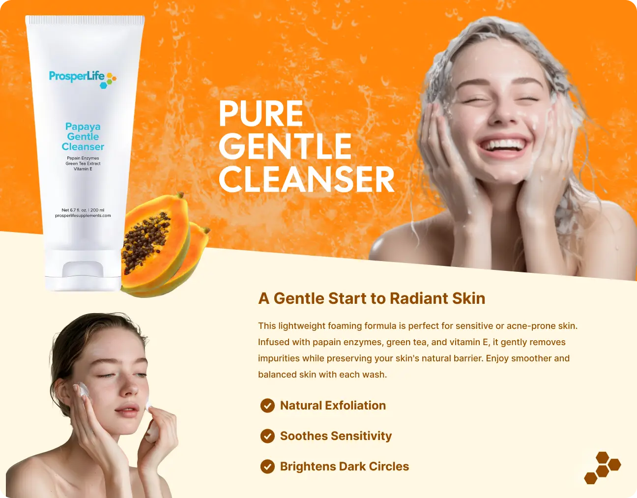 Papain enzymes derived from papaya fruit softly exfoliate, removing debris and dead skin cells without causing irritation.